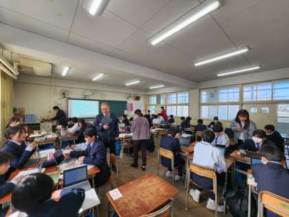 資料だけででなく、学習用端末も使って、グループで調べ、まとめています。