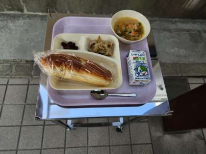 今日の給食の献立は、おさつパン、豚肉のバジル焼き、スープ、うずら豆のグラッセ、牛乳でした。