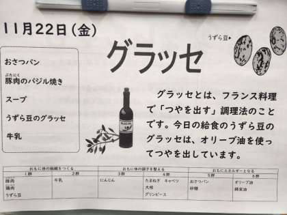 グラッセとは、フランス料理で「つやを出す」調理法のことです。今日の給食のうずら豆のグラッセは、オリーブ油を使ってつやを出しています。