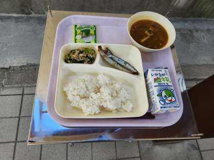 今日の給食の献立は、ご飯、焼きししゃも、さといもの和風カレー汁、ささみと小松菜のいためもの、まっ茶大豆、牛乳です。