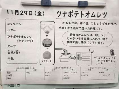 給食のオムレツは、卵、ツナ、じゃがいもを容器に入れて、焼き物機で蒸し焼きにしています。