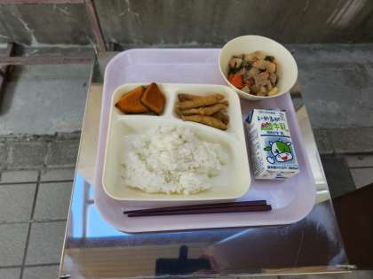 今日の給食の献立は、ご飯、きびなごてんぷら、含め煮、焼きかぼちゃの甘みつかけ、牛乳でした。