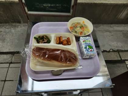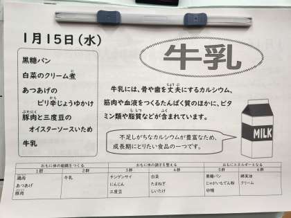 今日の給食の献立は、黒糖パン、白菜のクリーム煮、あつあげのピリ辛じょうゆかけ、豚肉と三度豆のオイスターソースいため、牛乳でした。