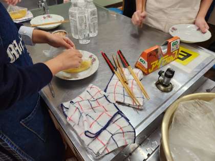 災害時に、調理するときや食べるとき、片付けする時に困ることについて、調理器具、ガス、電気、水、ごみ、作る人、食べる人など、様々な観点から考えました。そして、どのような工夫をすれば、その困難を乗り越えることができるかについて考えました。さらに、その考えを基にして、調理をしました。普段とは違う調理方法で、スパゲッティーをつくりました。