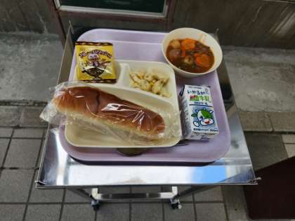 今日の給食の献立は、おさつパン、ビーフシチュー、カリフラワーとコーンのサラダ、カレーフィッシュ、牛乳でした。