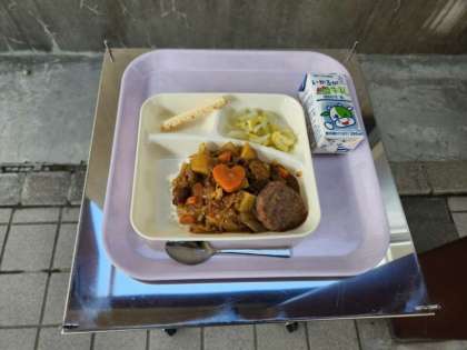 今日の給食の献立は、豚肉と金時豆のカレーライス、焼きミニハンバーグ、白菜のピクルス、棒チーズ、牛乳でした。