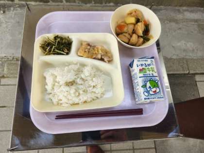 今日の給食の献立は、ご飯、鶏肉のおろしじょうゆかけ、一口がんもとじゃがいものみそ煮、水菜の煮びたし、牛乳でした。