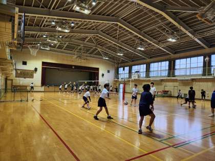 体育館で、男子バレーボール部と女子バレーボール部が活動しています。体育館を半面ずつ、狭い中、練習メニューなど工夫をして活動しています。