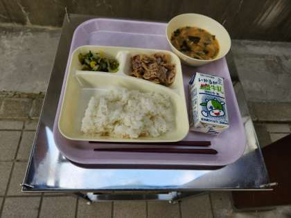 今日の給食の献立は、ご飯、豚肉のごまだれ焼き、みそ汁、きくなと白菜のおひたし、牛乳でした。