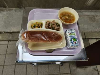 今日の給食の献立は、黒糖パン、豚肉のオイスターソース焼き、中華スープ、ツナとチンゲンサイのいためもの、牛乳でした。