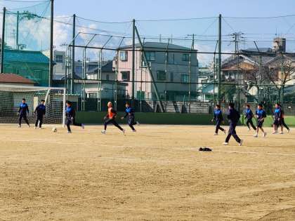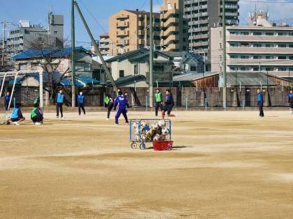 男子がサッカーに取り組んでいます。安定したボールコントロールとスペースをうまく使って、ゴールまでボールを運びます。