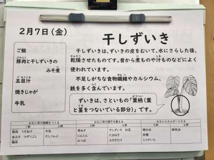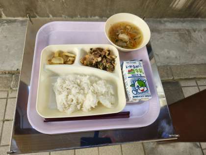 今日の給食の献立は、ご飯、豚肉と干しずいきのみそ煮、五目汁、焼きじゃが、牛乳でした。