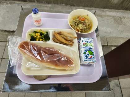 今日の給食の献立は、おさつパン、わかさぎフライ、スープ煮、ブロッコリーとコーンのサラダ、発酵乳、牛乳でした。