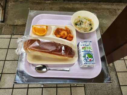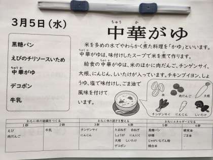 今日の給食の献立は、黒糖パン、えびのチリソースいため、中華がゆ、デコポン、牛乳でした。