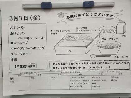 新たな進路へと羽ばたく3年生の卒業を祝う気持ちが込められています。今までの給食を思い出していただきました。