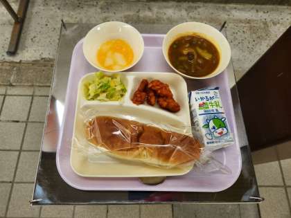 今日の給食の献立は、卒業祝い献立です。おさつパン、あげどりのバーベキューソース、カレースープ、キャベツとコーンのサラダ、フルーツゼリー、牛乳でした。