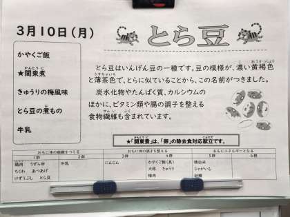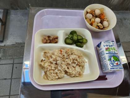 今日の給食の献立は、かやくご飯、関東煮、きゅうりの梅風味、とら豆の煮もの、牛乳でした。
