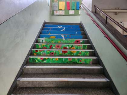 美術部の生徒が、卒業に向けて、階段アートを作成しました。