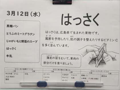 今日の給食の献立は、黒糖パン、とうふのミートグラタン、じゃがいもと野菜のスープ、はっさく、牛乳でした。