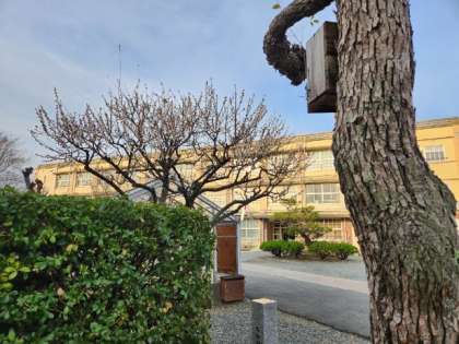 梅が咲き誇る中での卒業式。