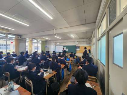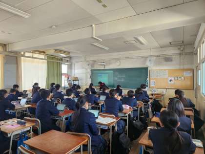 学級開きです。自己紹介や学習用端末の扱い方など、クラスごとで確認しています。