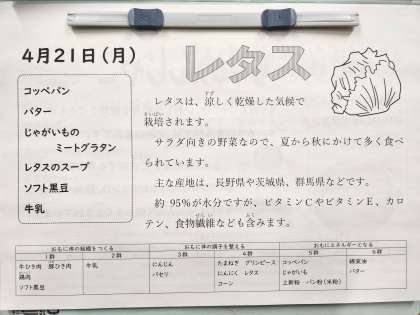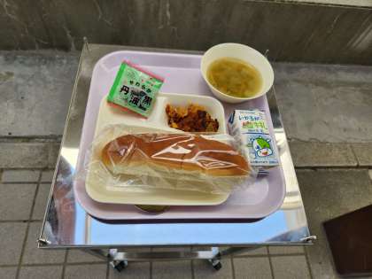今日の給食の献立は、コッペパン、バター、じゃがいものミートグラタン、レタスのスープ、ソフト黒豆、牛乳でした。