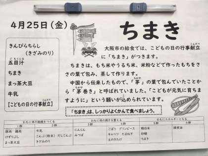 大阪市の給食では、子どもの日の行事献立に「ちまき」がつきます。