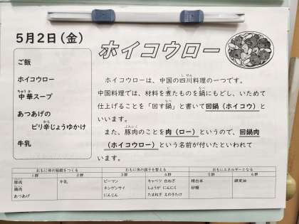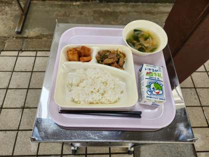 今日の献立は、ご飯、ホイコウロー、中華スープ、あつあげのピリ辛じょうゆかけ、牛乳でした。