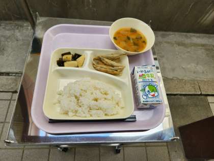今日の給食の献立は、ご飯、きびなごてんぷら、みそ汁、わかたけ煮、牛乳でした。