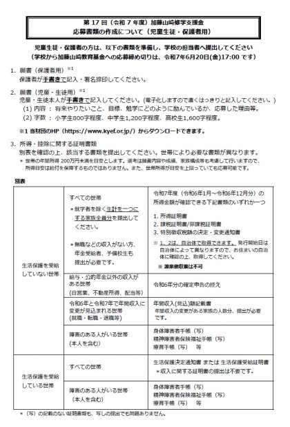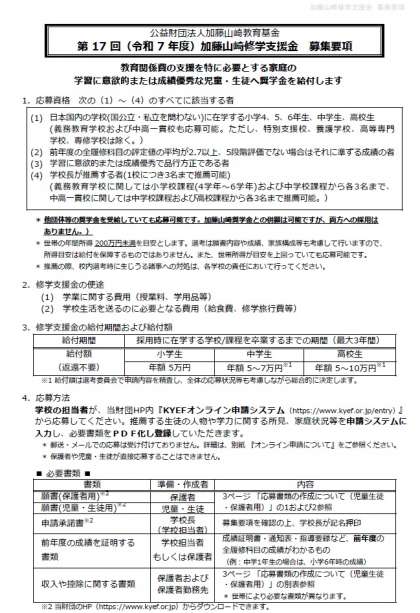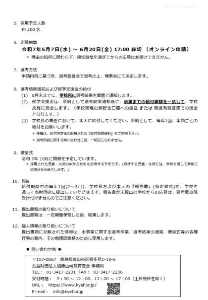 第17回(令和7年度)加藤山崎修学支援金 募集要項