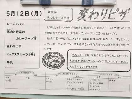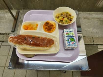 今日の給食の献立は、レーズンパン、豚肉と野菜のカレースープ煮、変わりピザ、ミックスフルーツ(缶)、牛乳でした。