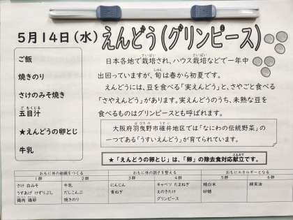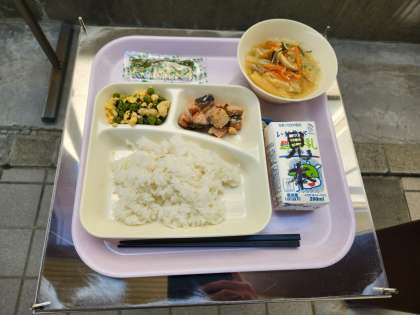今日の給食の献立は、ご飯、焼きのり、さけのみそ焼き、五目汁、えんどうの卵とじ、牛乳でした。
