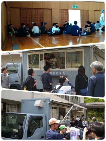 西和良小学校の跡地の西和良公民館で昼食です。キッチンカーからカレーライスを受け取り、体育館でいただきます。