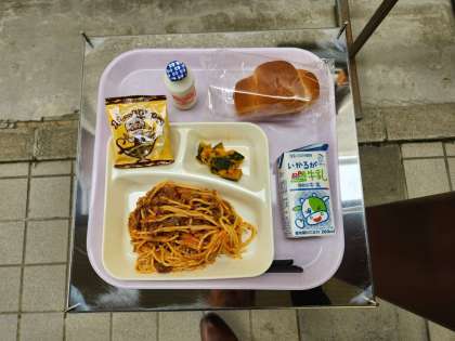 今日の給食の献立は、ミニコッペパン、ミートソーススパゲティ、焼きかぼちゃ、カレーフィッシュ、発酵乳、牛乳でした。