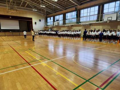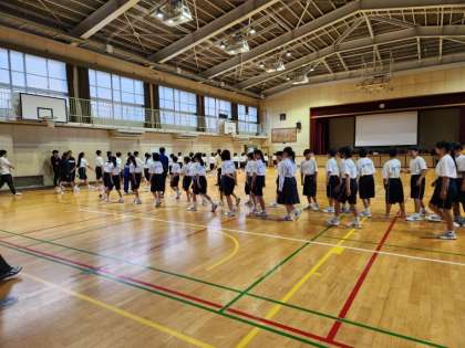 体育大会学年練習の様子です。開会式の入場方法の確認です。