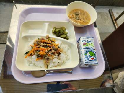 今日の給食の献立は、豚ひき肉とにらのそぼろ丼、みそ汁、きゅうリのゆず風味、牛乳でした。