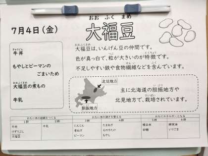 今日の給食の献立は、牛丼、もやしとピーマンのごまいため、大福豆の煮もの、牛乳でした。