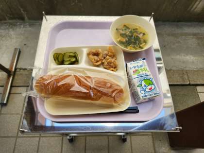 今日の給食の献立は、黒糖パン、鶏肉のからあげ、ハムととうがんの中華スープ、きゅうりのピリ辛あえ、牛乳でした。