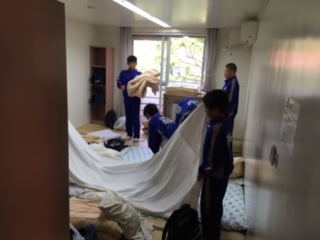 起床時刻です。班員で協力して寝具の片付けをしています。