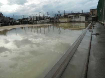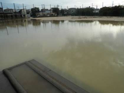 夕方の大雨で、運動場に大きな池ができました。
