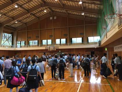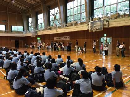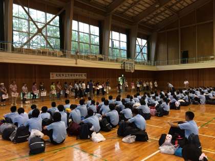 4〜6組は鳥取県倉吉市で民泊を実施しています。写真は、入村式で各家庭との対面をしているところです。