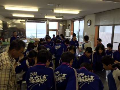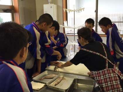 残念ながら大雨のため、鳥取県岩美町の地引網体験ができませんでした。代わりにコミュニティセンターでイカのさばき方体験をしています。