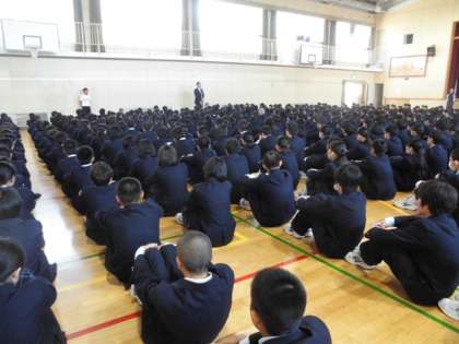 全校集会 学校長講話の様子です。