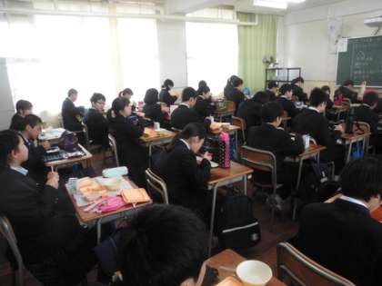 1年生 給食配膳の準備と昼食風景です。