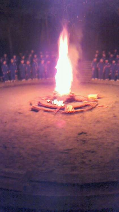 キャンプファイヤーです。各学級対抗のゲームを行っています。