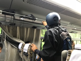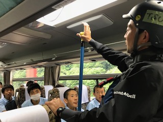 レストランからラフティングの着替え場所までのバスの中で、ラフティングの説明を聞きました!
