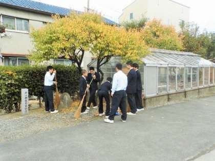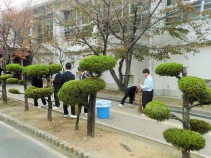 朝の登校風景と、正門付近のボランティア清掃の様子です。