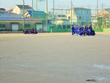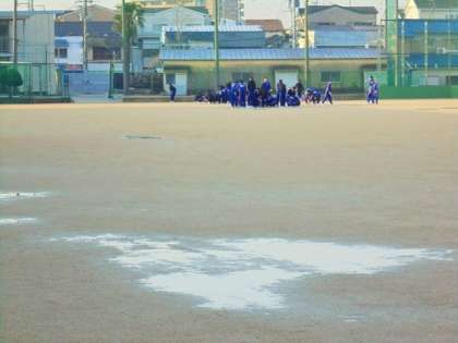 朝、昨日の雨で、ぬかるんでいる運動場を整地しています。