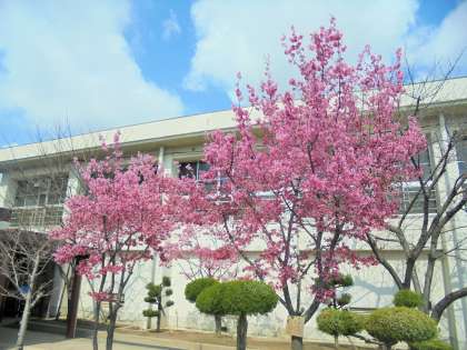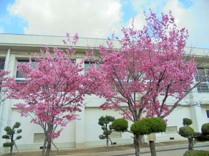 体育館横の寒緋桜(カンヒザクラ)は満開です。