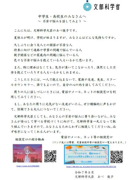 文部科学大臣メッセージ「〜不安や悩みがあったら話してみよう〜」
